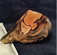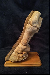 Looking at external as well as internal structures in the hoof capsule and lower leg. Internal anatomy includes coffin bone (P3), short pastern (P2), long pastern (P1), distal portion of the cannon bone as well as a lateral sesamoid. Notice the tight connection between the coffin bone and the hoof wall.